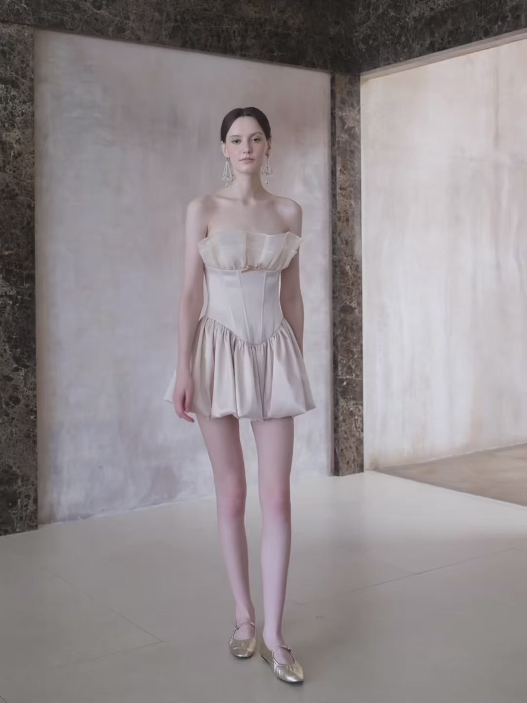 The structured corset bodice sculpts the figure, while the airy hem flutters with every step — balancing discipline and dream.