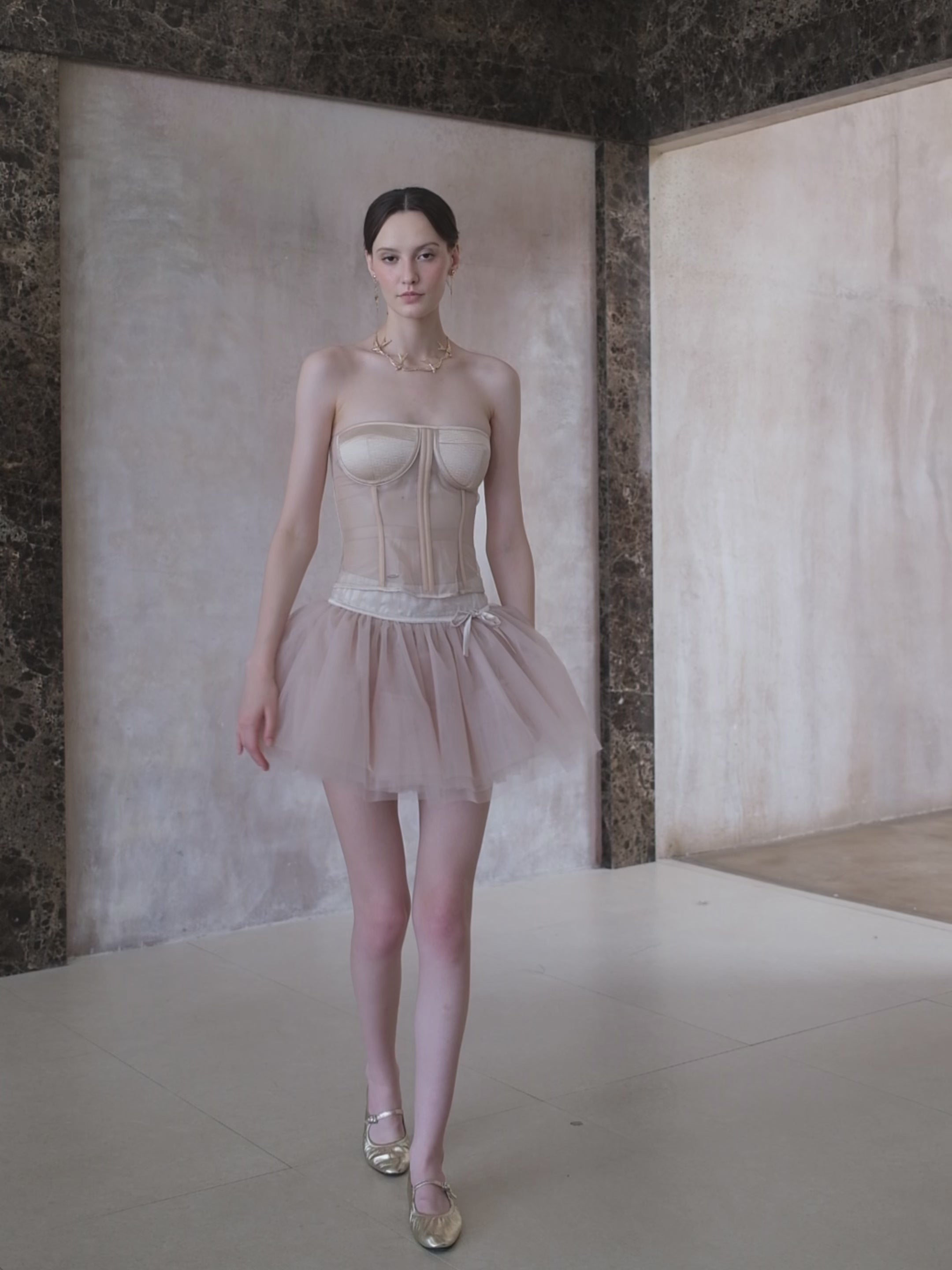 Selected acetate fabric drapes with a fluid elegance, offering a silky, skin-soft touch and a natural, pearl-like sheen. The bodice is shaped through sculptural gathering, where wave-like pleats fold inward toward the center—refining the silhouette, defining the waist, and giving the still fabric a sense of “liquid sculpture.”