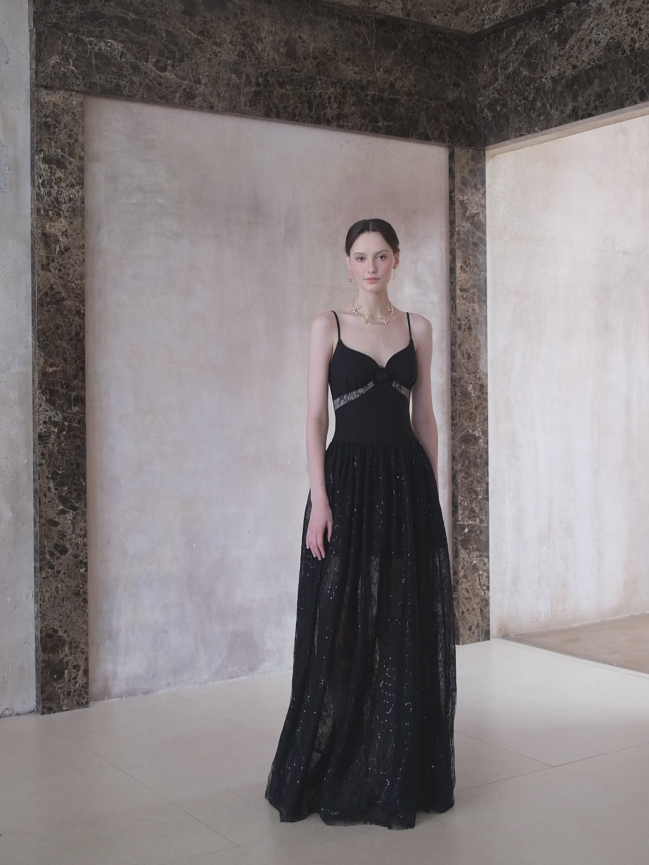 Inspired by the elegance and liveliness in the painting “Julie Manet Playing the Violin in a White Dress”, it transforms the beauty of light and shadow in the artwork into the shimmering interplay of lace and sequins on this black gown.