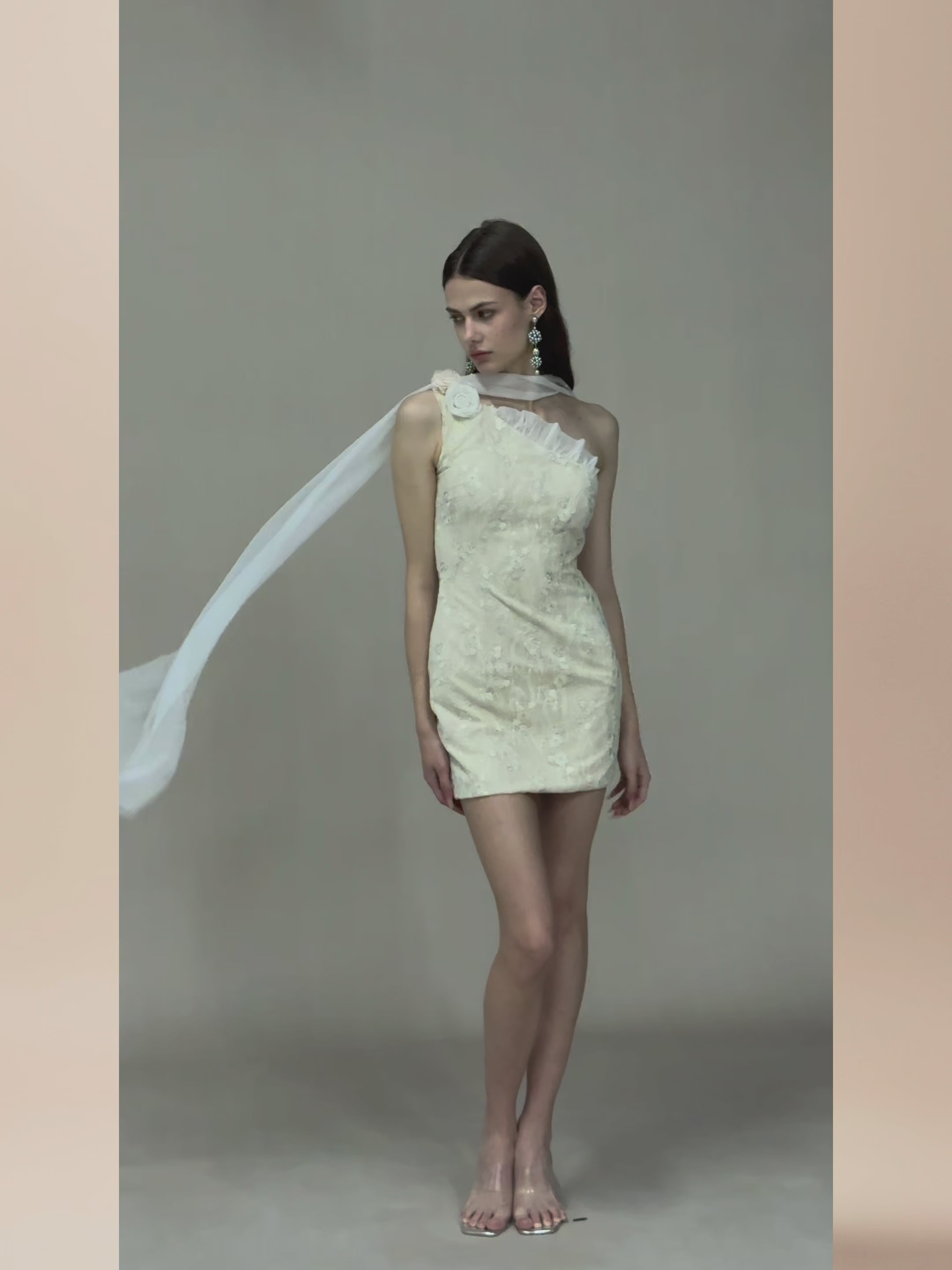 The asymmetrical neckline blooms with delicate ruffles and a single sculpted flower, while a sheer silk drape cascades like whispered air against the skin.
